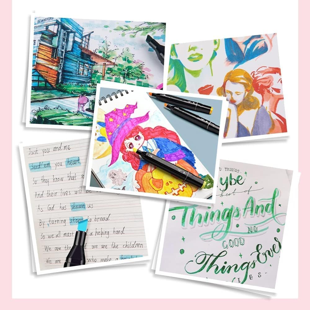 The markers contain alcohol-based ink, which blends smoothly and dries quickly. They work best on thick paper or cardboard to prevent bleeding. Each marker has a colored cap and number code for easy color recognition.